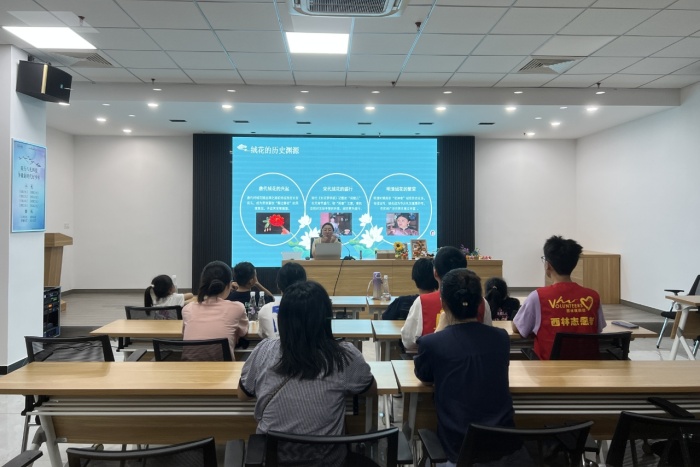 绒花承载着中国人对美好生活的诗意表达,其历史最早可以追溯到唐代。活动开始,高晓宇老师将绒花的千年古韵娓娓道来,从唐代长安城“鬓边簪花”的雅事,讲到明清百姓“头戴绒花四季荣华”的民俗盛行,绒花已走入寻常百姓家,现场的大小朋友们都沉浸在绒花文化的独特魅力之中。